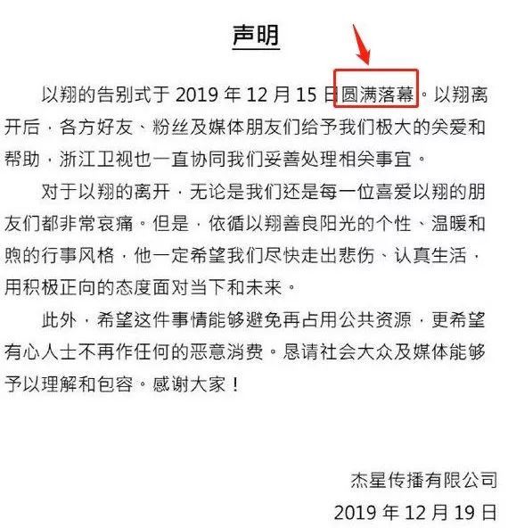 但最让人惊讶的是,高以翔经纪公司用“圆满结束”四字形容高以翔离世,引起了网友的众怒。