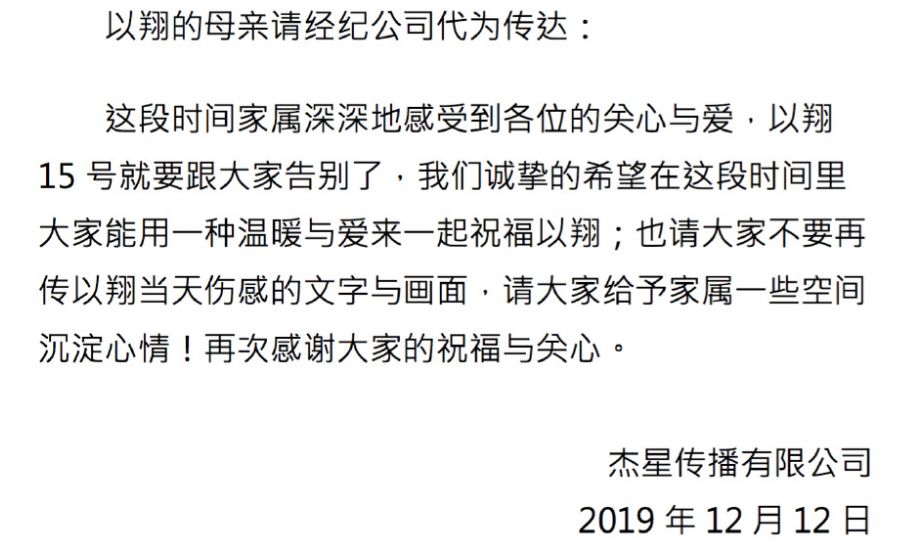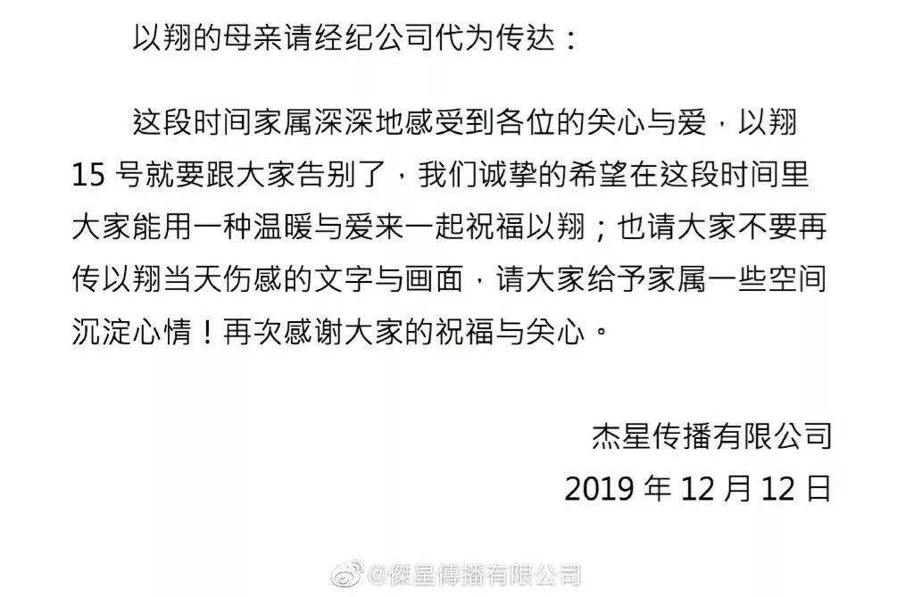 12月19日,高以翔经纪公司再次发声,希望有心人士不要再恶意消费高以翔逝世一事,大意就是让这件事翻篇不要再讨论。