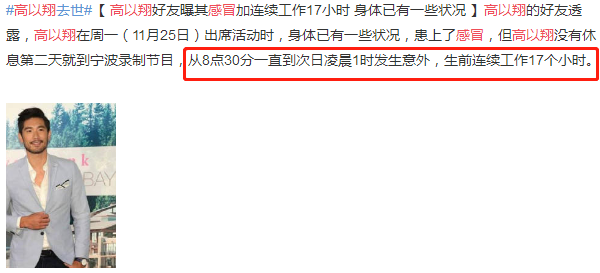 侧面也反应高以翔经纪公司没有做好保护员工的责任,出事前高以翔曾跟理发师讲过自己感冒了,经纪人不会不知道,但经纪公司却并没有与栏目沟通推迟或者减少拍摄。特别是像高以翔这样安分守己不是特别火的艺人来说,只会坚持顺从公司的安排。