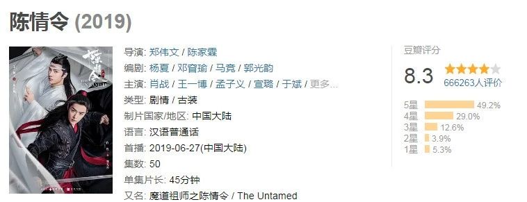 而《陈情令》也不负众望,不仅火爆了这个夏天,更是红到了整个东南亚国家,被翻译成十几种语言在海外传播,让更多国家可以感受我们的国风文化。见面会、演唱会开了一场又一场,各款周边卖到脱销,豆瓣评分从5.4到8.3,创下了一个个让人骄傲的播放记录。