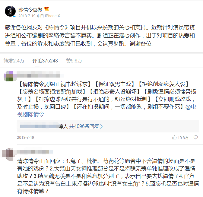 然而这部剧拍摄的时候,可是骂声一片,从演员到造型,遭到了粉丝几十万条黑评,逼得官博不得不关闭评论。从全网骂到全网夸,《陈情令》真的是这个夏天的一个奇迹。