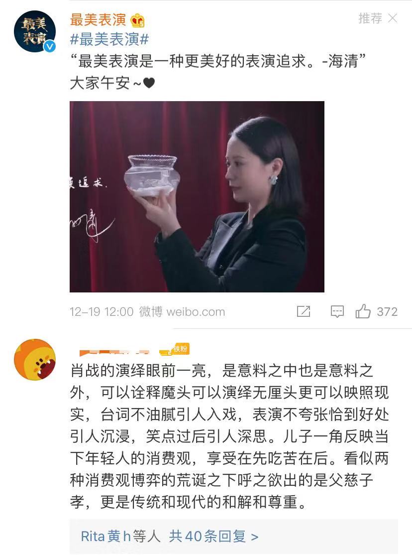肖战还参加新浪微博举行的最美表演,肖战演出的《家规》还是获得很多网友和粉丝的认可,这次肖战表演一个很皮实的男生,在父亲的调教下对家规有了新的认识,肖战表演很自然,也很贴近生活,有点皮实的可爱。