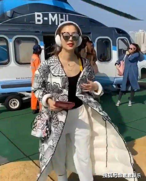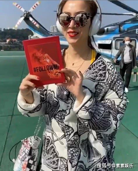 穿着风衣的郑秀文开心的从私人飞机上走下来,并且是戴着自己的新DVD。