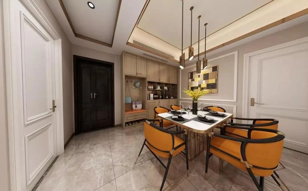 适合营造沉静的氛围。采用金属或者具有木纹、大理石纹的材质,或是搭配黄色、白色、咖色,在灯光映衬下,很容易打造高级质感。