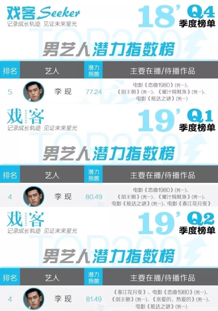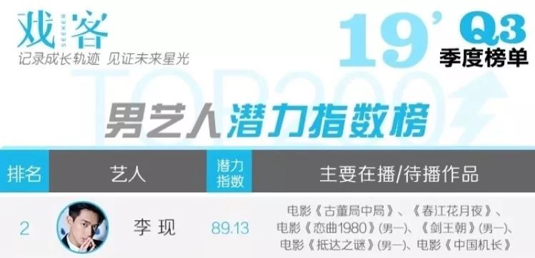 从17年第一期潜力榜开始,李现一直位居戏客潜力指数榜TOP5的位置,其作品一直是他位居榜单前列最有力的底气。