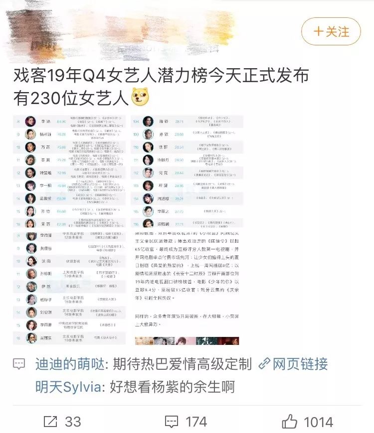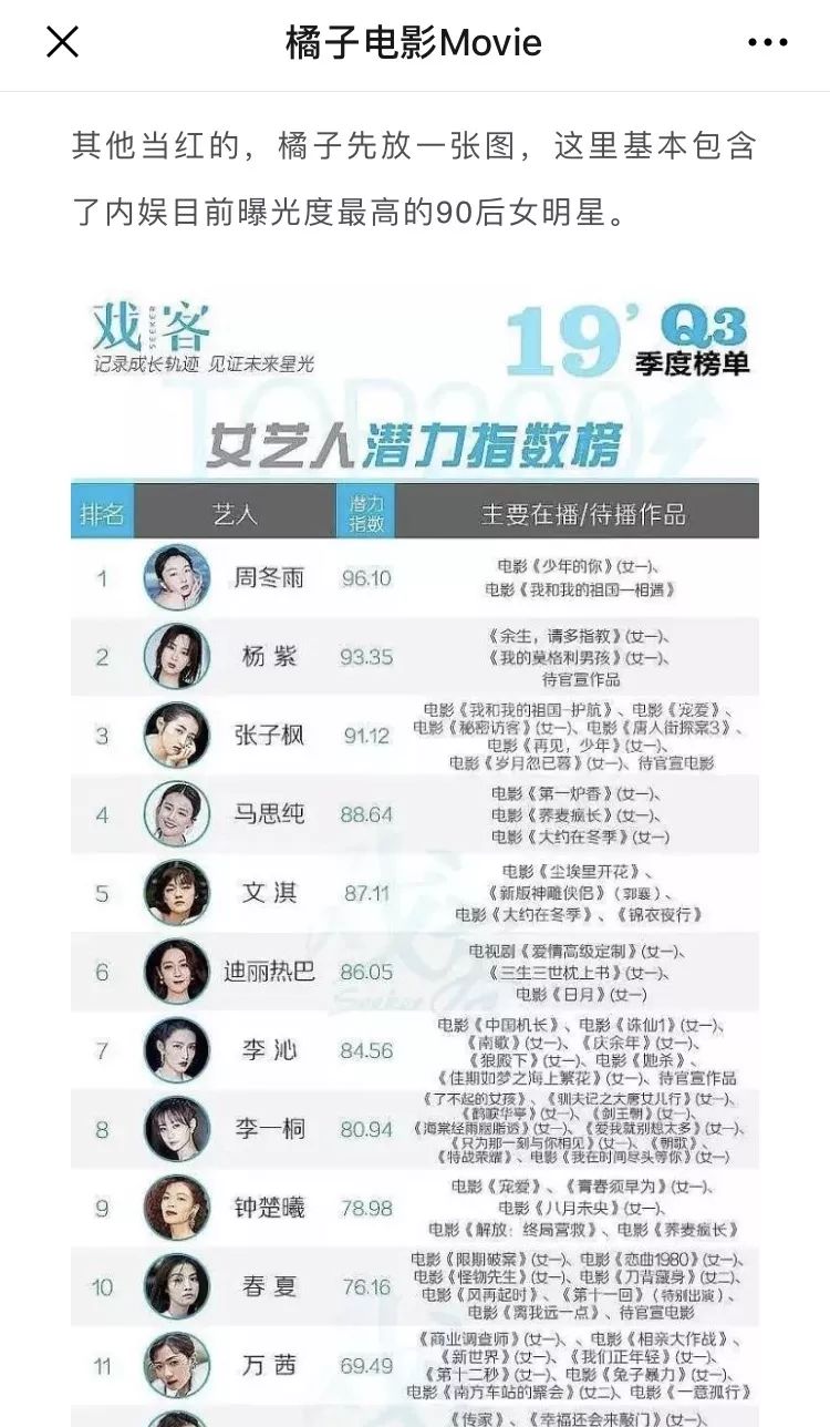 每个季度,戏客一直在为推出一份独一无二的潜力榜单做努力,潜力指数榜单只依据演员待播剧的量级、角色量级、年龄和综合条件,不参照任何可操作的数据,按照科学的计算方法计算得出!