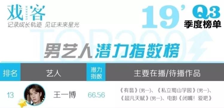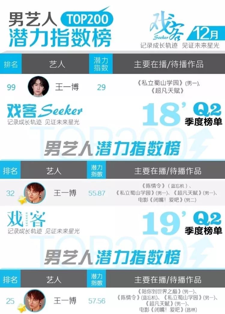 从17'Q4到19’Q3王一博在戏客潜力榜单的排名就一路上升,从特别关注演员,到进入TOP20。