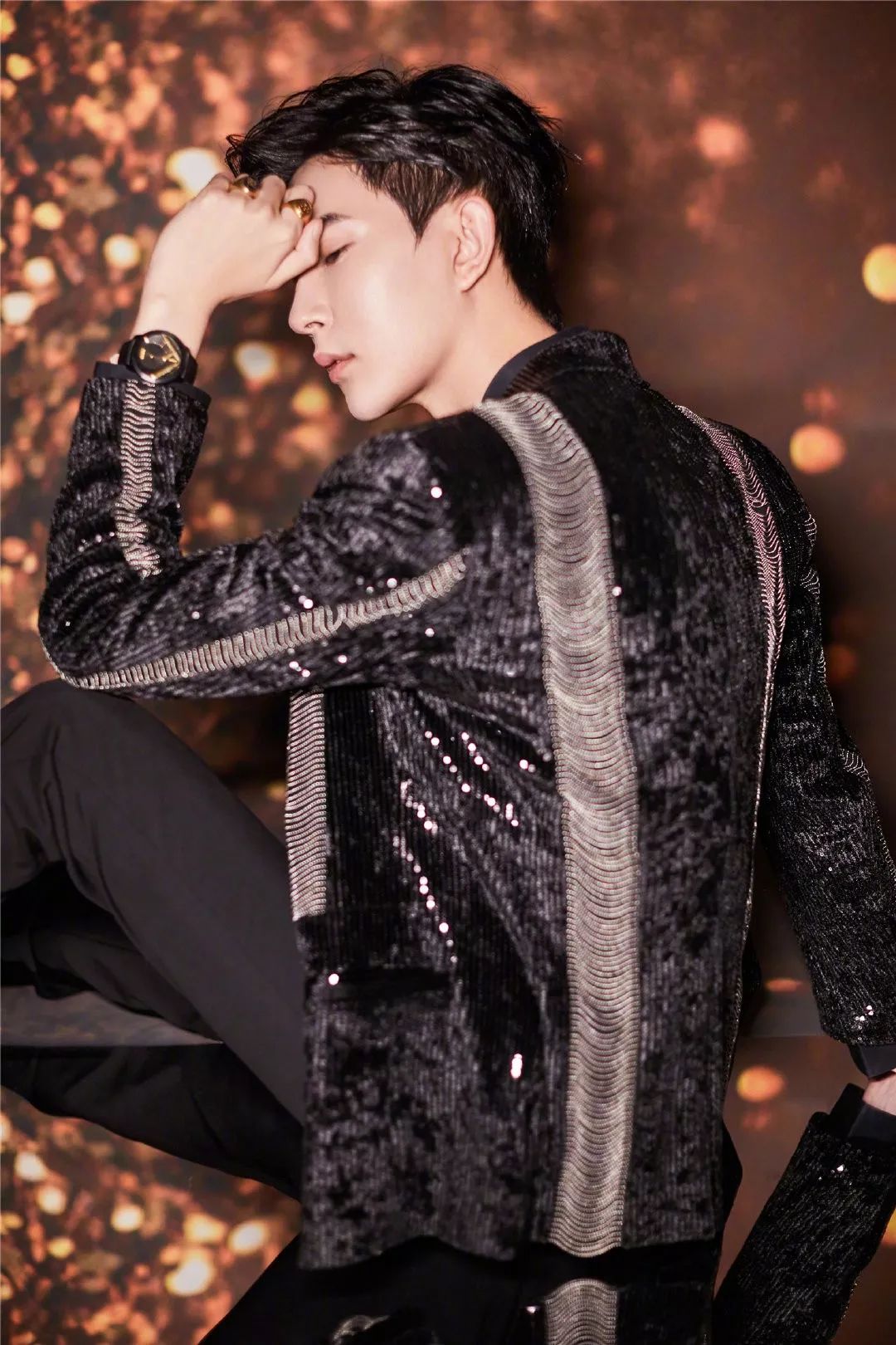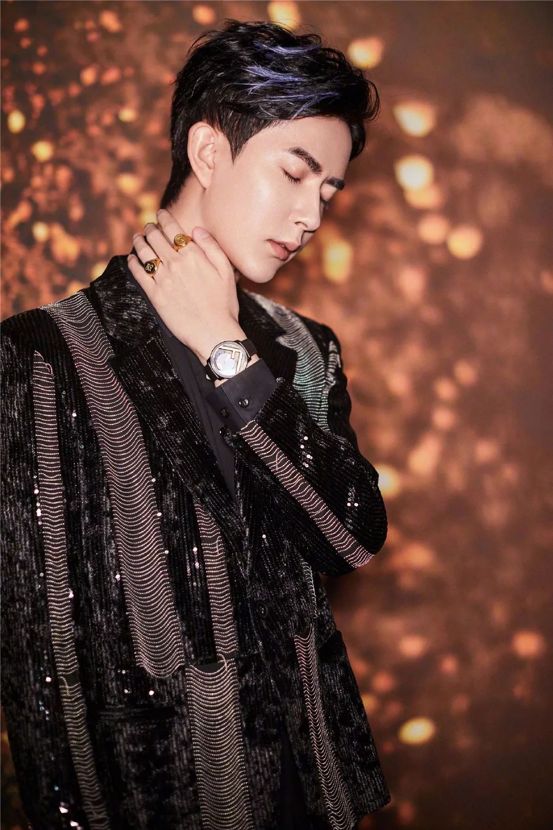 ▼于朦胧金骨朵网络影视盛典造型图集,定制的珠链装饰西服,挑染的发色,精致闪耀的黑色正装look,带着奢华矜贵的格调。