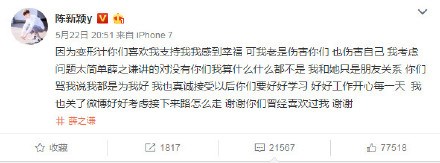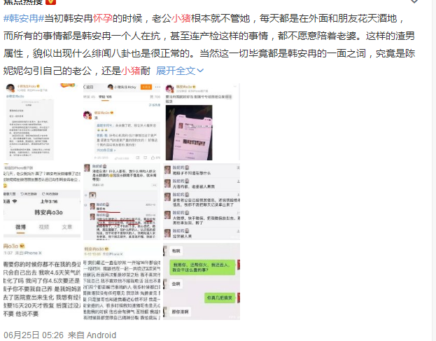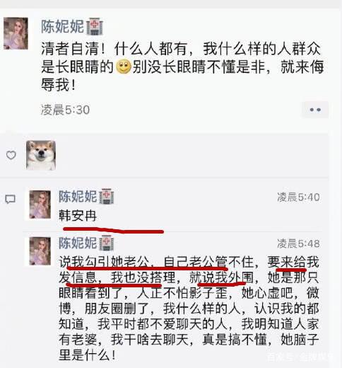 陈妮妮不认啊,在朋友圈喊冤称没有勾引小猪先生,反而是小猪先生主动给她发信息。韩安冉不信又在微博把陈痛骂了一番,反正韩和陈就这样撕逼了好几个来回。