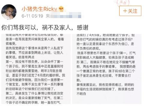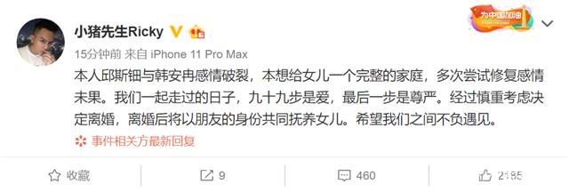 下午,韩安冉的老公小猪先生也发文承认离婚。