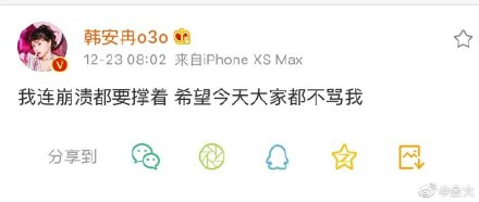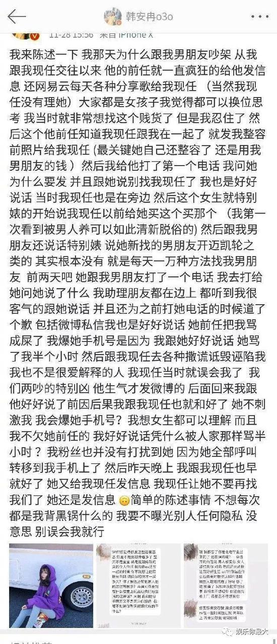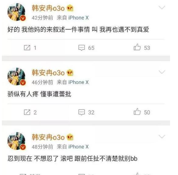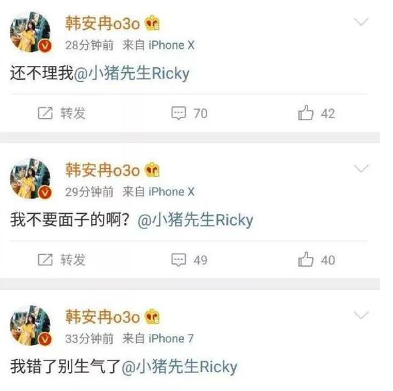 在一起不到两个月,就开始撕逼,韩安冉在微博称小猪和前任一直有联系,两个人因为这个问题天天吵架。