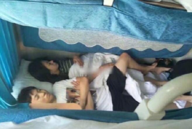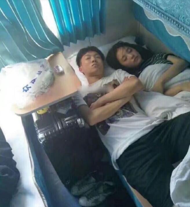 还被网友在火车上偶遇,两个人在卧铺上挤一张床睡。