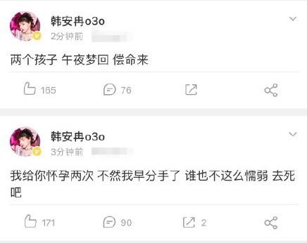 后来韩安冉还自曝为了男方流过两次产,并称男方不负责任,既不娶她也不要孩子。