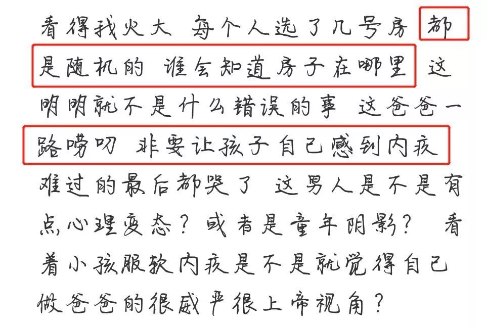 最最无语的是,他们选到的房子比较远,一路上杨烁不仅没有鼓励儿子坚持下去,反倒一直在说阴阳怪气的风凉话,仿佛在抱怨儿子选的这个房子。