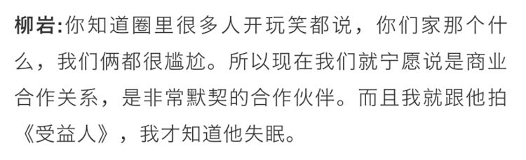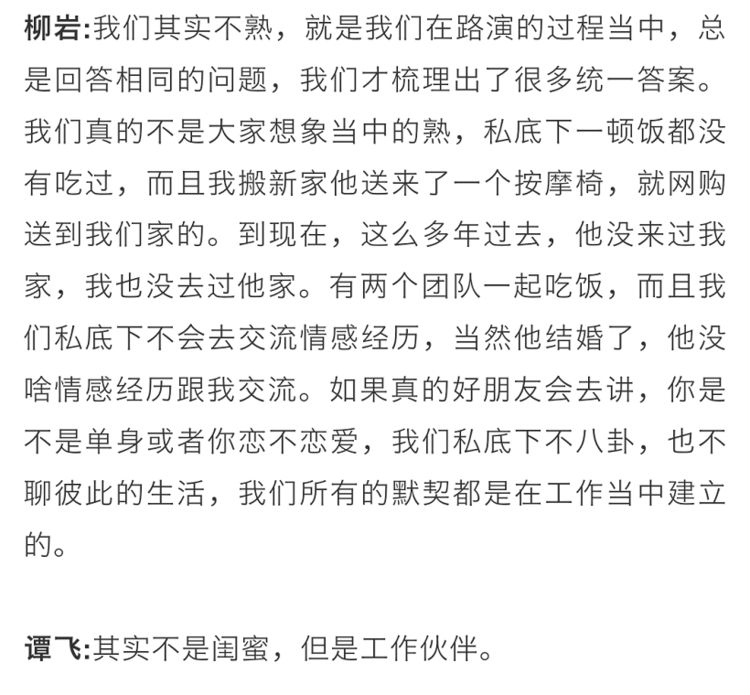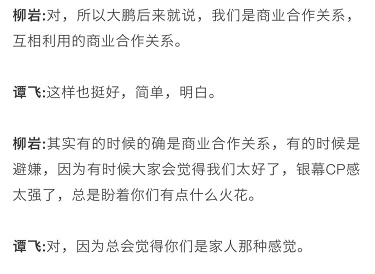 柳岩解释,大鹏已经结婚了,所以在平时不会和自己有什么情感上的交流,而且两人都不八卦,因此几乎不会互相聊对方的生活。大家看到的所有的默契,其实都是在工作中建立起来的。因此,不管大鹏还是柳岩,都更愿意把两人的关系称之为“商业合作关系”。