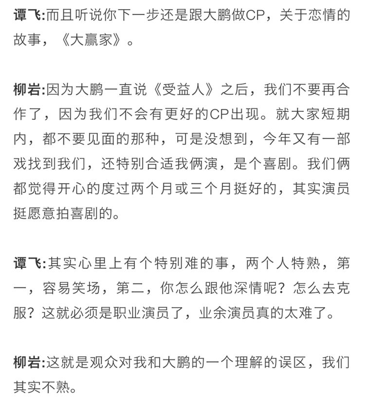 在采访中谈到,柳岩和大鹏在《受益人》之后又合作了一部喜剧名为《大赢家》。柳岩表示原本在《受益人》之后大鹏说两人不要再合作了,但因为剧本太适合了,再加上都想演喜剧,因此就选择了继续拍。