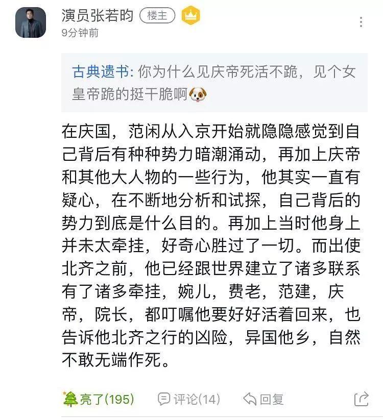 对于剧中范闲的种种行为,亦是张若昀加以深思后的呈现,比如为何不跪庆帝反跪北齐小皇帝?