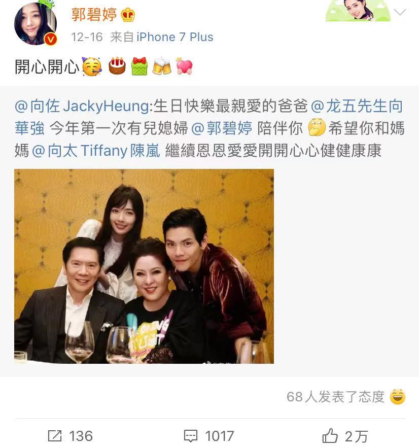 12月16日是向华强的71岁生日,郭碧婷和向佐也为父亲庆生,这可是郭碧婷嫁入向家为公公过的第一个生日,应该很重视,向佐发微博庆贺,郭碧婷转发表示很开心,看来一家人和睦幸福,就是最美好的结果。向华强已经71岁,也该是抱孙子的时候,他们一家都很期待迎来向佐和郭碧婷的孩子吧。