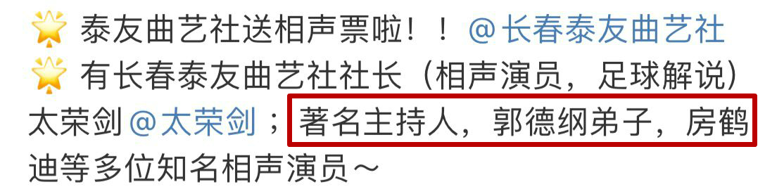 比如长春这个茶艺社在介绍房鹤迪的时候,就是这样写的:著名主持人、郭德纲弟子、房鹤迪。