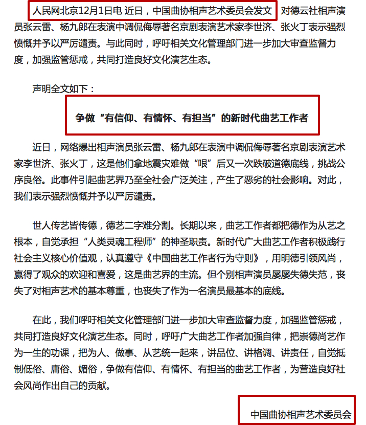 事实上,11月30日的时候,曲协还发表了文章,对张云雷进行了批评。