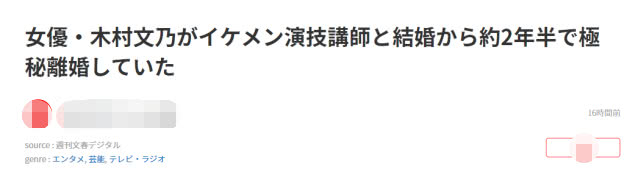 据日媒12月25日报道,32岁的气质女神木村文乃,在圣诞节当日被曝出已于今年4月份秘密离婚,结束了与圈外不知名丈夫三年的婚姻。此消息曝出后,引发一片哗然,毕竟作为日本国民度超高的女艺人,木村文乃的一举一动都备受网友关注。随后有媒体向木村文乃所属的经纪公司求证,其经纪公司也证实了此事,宣布木村文乃已经恢复单身。