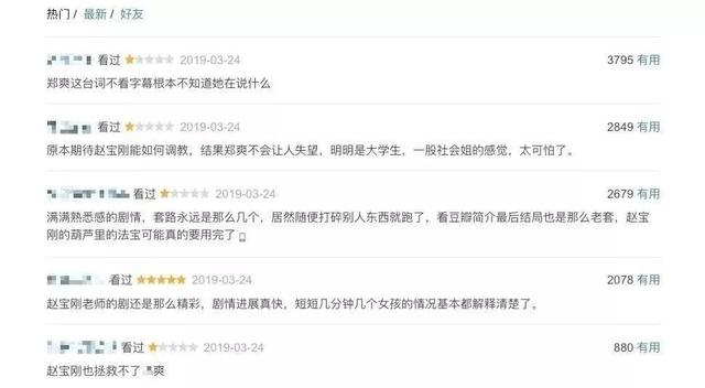 观众失望的,不仅是郑爽的演技,还有赵宝刚导演对青春的定义。赵宝刚直接把90后的故事拍成了“狗血的青春”。这部剧的豆瓣评分更是低至4.7分,刷新了赵宝刚作品的最低评分。
