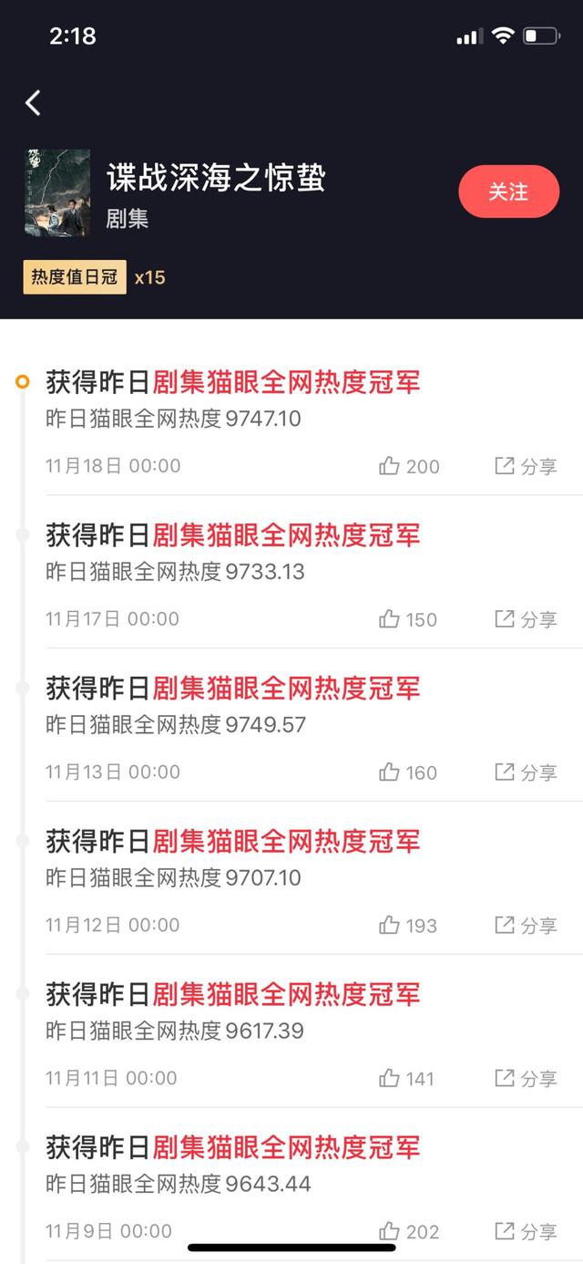 张若昀和王鸥主演的谍战剧《谍战深海之惊蛰》,开播前就被观众看好,男女主是分别出演过谍战剧《麻雀》和《伪装者》的实力派演员。开播之后,口碑还是不错的,豆瓣开分高达7.7分,猫眼热度值日冠军拿下了15个。