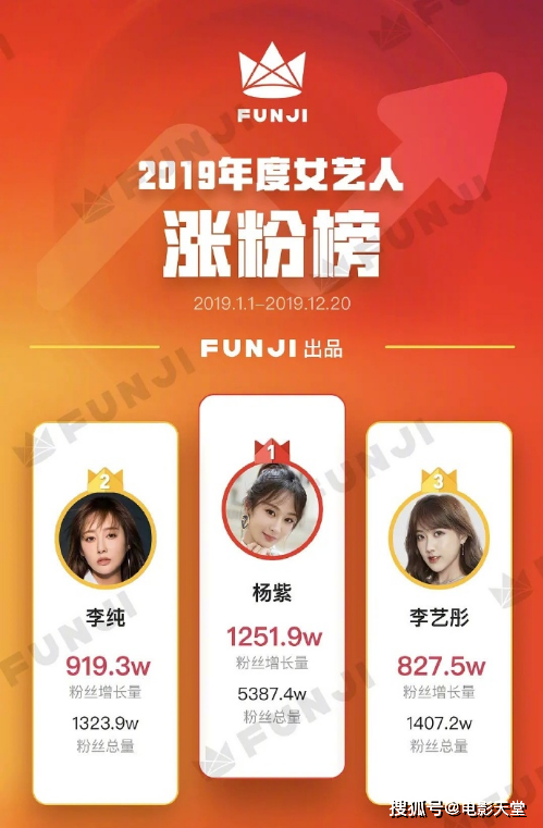 女艺人涨粉榜单中杨紫可以说是凭借着一己之力力压圈里众多流量小花啊,别人最多就是920万左右的涨粉,杨紫直接是1200万左右,高居榜首。此外不得不提的是920万涨粉的正是在《庆余年》中饰演司理理的李纯,从某种方面来说,李纯也算是此份榜单中的最大赢家了,毕竟杨紫的热度一直都不错,而李纯算是爆红了。