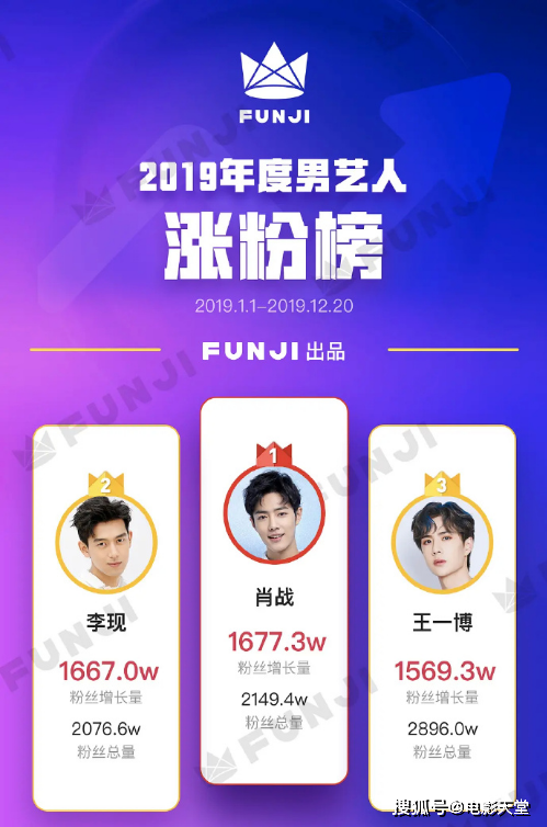 榜单中男艺人涨粉情况最高的三位就是今天爆红的电视剧男主肖战、王一博、李现了,三人平均下来每人涨了大概1600万左右,虽有偏差但大都不相上下。此外,曾热播的电视剧《长安十二时辰》中的易烊千玺也仅次于三人,涨粉1300万左右,而同是三小只中的王俊凯和王源就没有千玺这么高的涨粉数了。