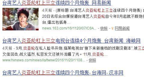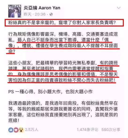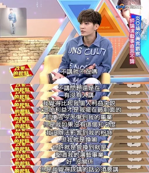 上至国家大事,下至鸡毛蒜皮,超爱写小论文。闹最大的一次是2016年单干台湾三立电视台,三立盛产优质偶像剧,《MVP情人》《命中注定我爱你》…艺人恨不得笼络这颗香饽饽,炎亚纶好一个硬气,曝光三立私自盗用他的身份证复印件,向政府申请辅导金用作拍戏的费用,三立发声明否认,他继续放大招,直接就把以前合作拍《后菜鸟的灿烂时代》的烂事,比如拍戏没剧本啦,打造人物形象不给资金啦,造谣污蔑啦给抖了出来。最后炎亚纶还在脸书上发了一篇千字文,喊话三立领导:“你要是知错不改,时代会淘汰你的!”