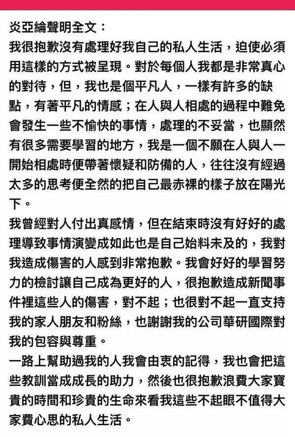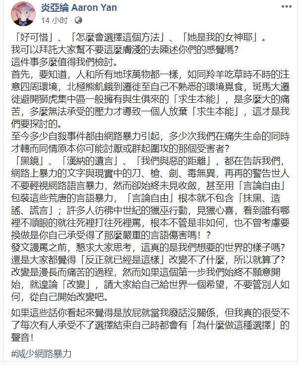 炎亚纶在脸书直言:“现正热映‘马后炮型虚伪社会’。”他转发了一篇两年前写下的“呼吁行展会资讯业规范”。其中提到剧组人员因工时过长,导致车祸、癫痫等,台湾地区小演员受到的不公平待遇…最后说别再纵容小错误,也勿以善小而不为,模式冷眼的方式最终我们大家都会自食恶果。