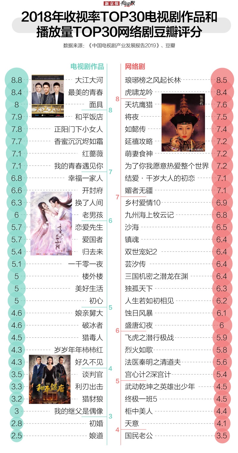 在2018年上星剧里,《大江大河》《正阳门下小女人》《最美的青春》在收视率和口碑上均有不俗表现,其中《大江大河》8.8的豆瓣评分,成为2018年口碑最高的一部电视剧。