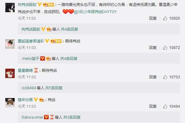 而当红人气明星肖战的粉丝点赞留言,显然处于次席,一些点赞留言,都是一万次上下,与朱一龙形成“流量”上的差距。排在第三点赞顺位的,则是张艺兴的粉丝们制造的点赞留言数量,均在八千次点赞上下。