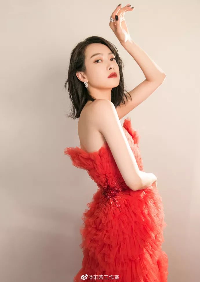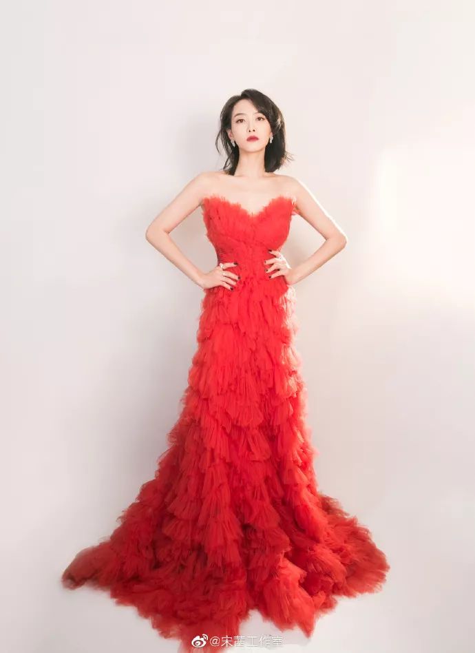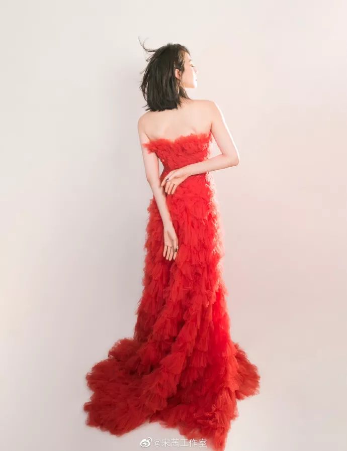 宋茜欧尼出席2019国剧盛典红毯时,身穿的这件Yanina Couture红色高定纱质礼服裙令人印象深刻。一袭蝴蝶抹胸红丝绒长裙似火似焰,层叠薄纱间,蝴蝶飞舞,是燃不尽的炙热与艳丽啊~