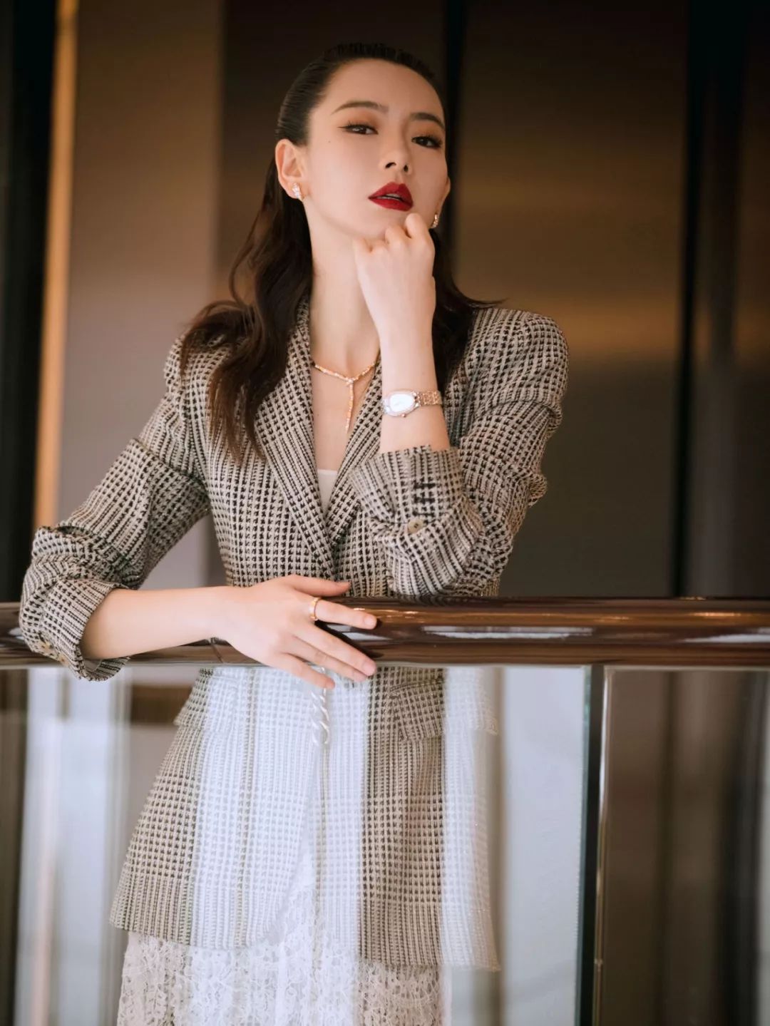 还有这套OL必备的格纹西装,内搭白色镂空荷叶边背心,硬朗中妩媚自显,应该是来年升职加薪的常胜look战衣。