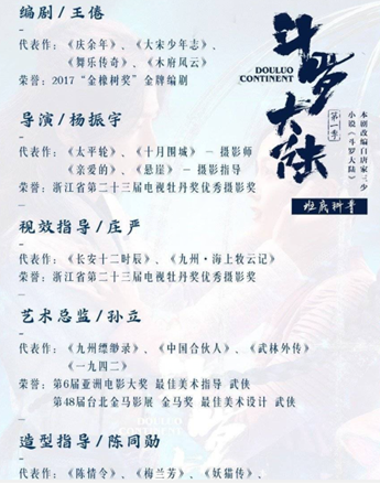 《陈情令》的造型指导这次也是出现在《斗罗大陆》剧组中,所以在剧中的造型大家可以放心了,应该会很不错,《斗罗大陆》的编剧就是《庆余年》的编剧,唐家三少也是有参与《斗罗大陆》哦,《十月围城》导演执导的《斗罗大陆》,《长安十二时辰》视效执导也有参与《斗罗大陆》,可以说《斗罗大陆》官方为了此剧的收视率也真的是很用心,全部采用圈里很优秀的导演,编剧,造型指导和视效执导等等。