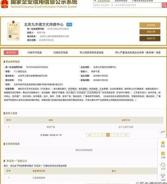 易烊千玺早在2018年就当老板了,他创办公司,取名为北京九木德文化传媒中心。根据工商注册显示,这是家独资公司,完全由他独立控股。