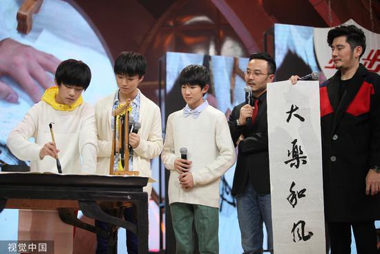 2014年12月10日,TFboys录制《天天向上》。这个时候他还很稚嫩,但是在舞台上写书法,也能立刻进入状态