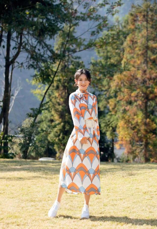 一袭橘蓝相间高领长裙搭配舒适的小白鞋,腰间的白色宽腰带显出纤细的腰线,在阳光下的娜团长显得温婉美好,与大自然融为一体!