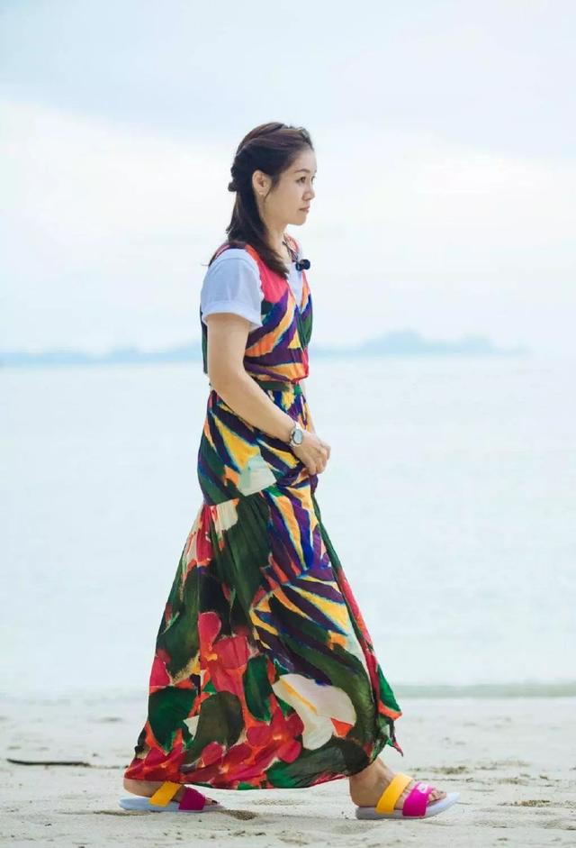 看到同伴们穿上花俏的长裙,李娜也忍不住换上了彩色花长裙,内搭一件白T,休闲又好看!喜欢穿吊带裙子又不想太暴露的女生可以参考一下。