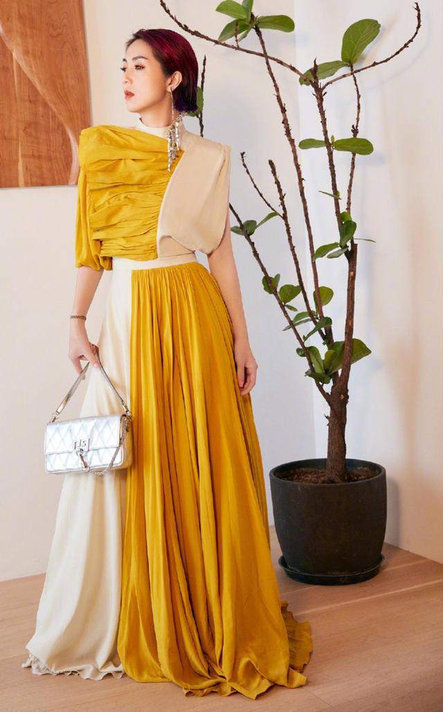 杨千嬅的其他look也是非常的有个性,就比如参加活动的她身穿的这件拼接款的黄色连衣裙,将明黄色与鹅黄色两个深浅度不同的色彩放在一起,看上去既合适又不乏层次感。胸前的褶皱可以让整个look看上去更为的丰富特别,堆叠出了一种非常高级的感觉。而微微散落下来的裙摆,轻盈又飘逸,尽显出满满的淑女范儿,让人觉得格外的有魅力。