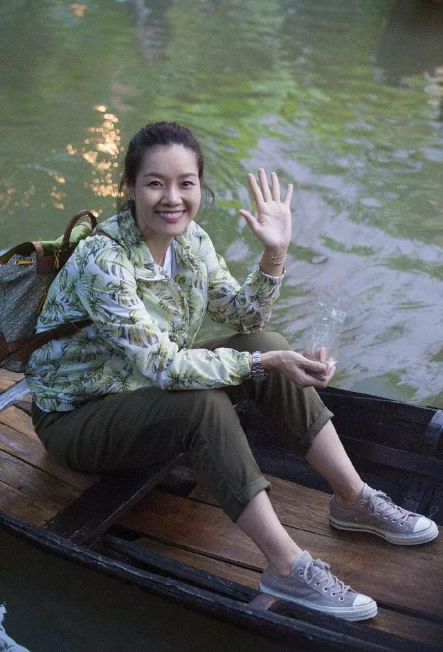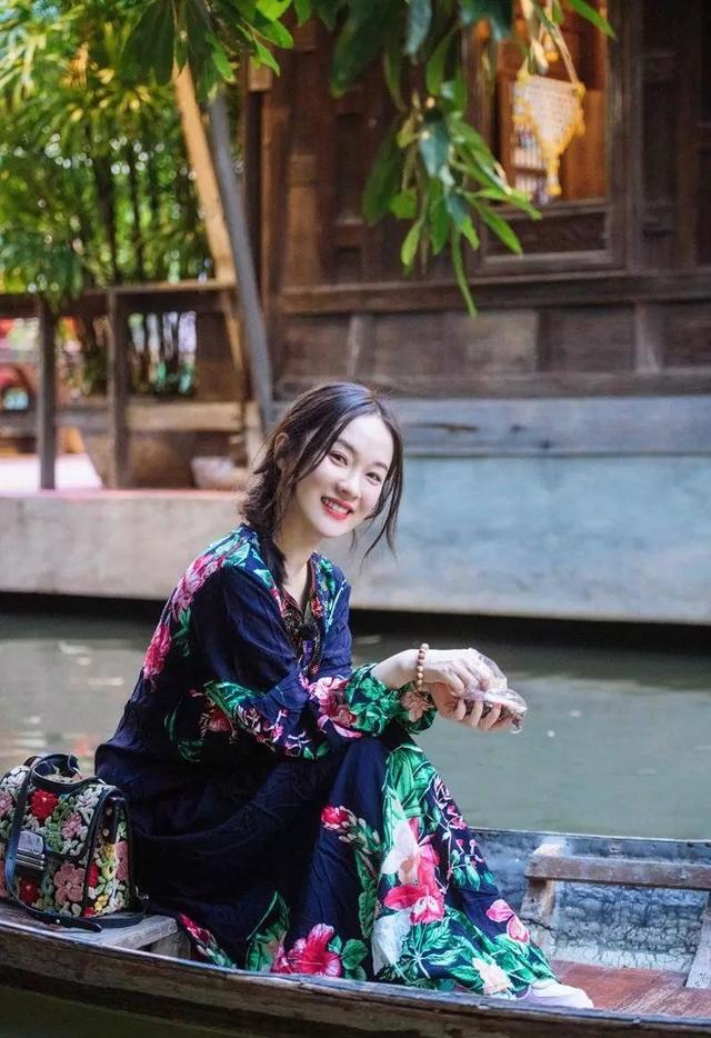 坐在小船上的霍思燕身穿一袭深蓝色印花长裙,搭配刺绣花纹包包,不说还以为是一套的,可谓是可爱与美丽并存!