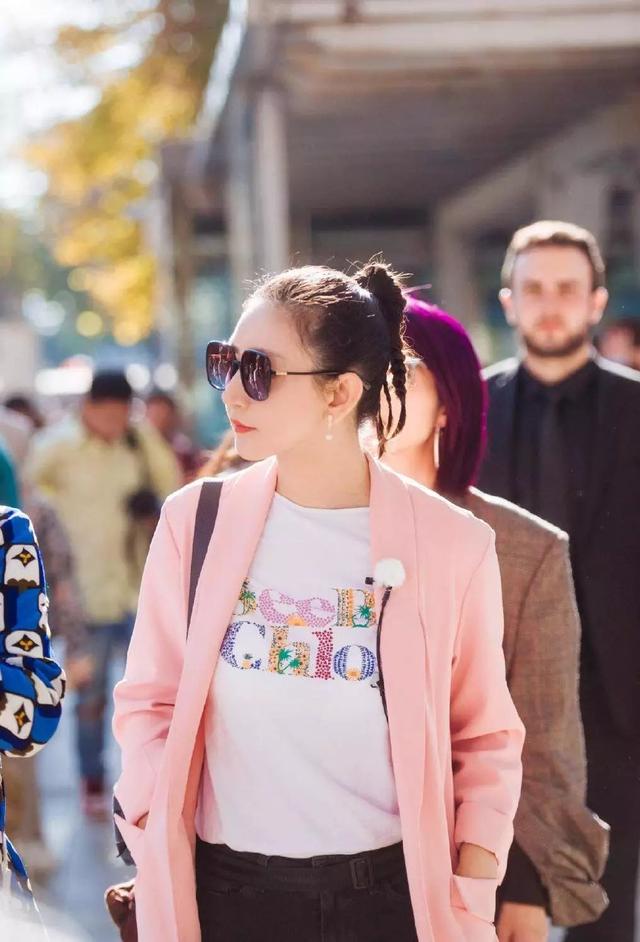 如此少女的粉色穿在大菲姐的身上都能穿出霸道总裁的感觉,独特的编发尤其出彩,内搭白色T恤,墨镜一戴,双手插袋,行走都能自带BGM。