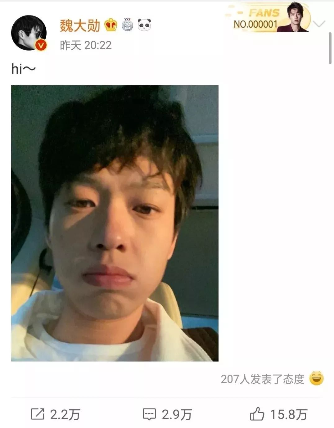 然而这并不能打消网友们八卦的热情。11月3日魏大勋更新自己的微博,晒出了一张自拍照片并配文:“hi~”。
