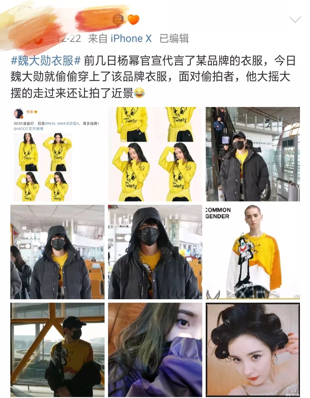 12月6日,有网友发现杨幂和魏大勋戴了同一款帽子,照片中,两人帽子的划痕都一模一样。
