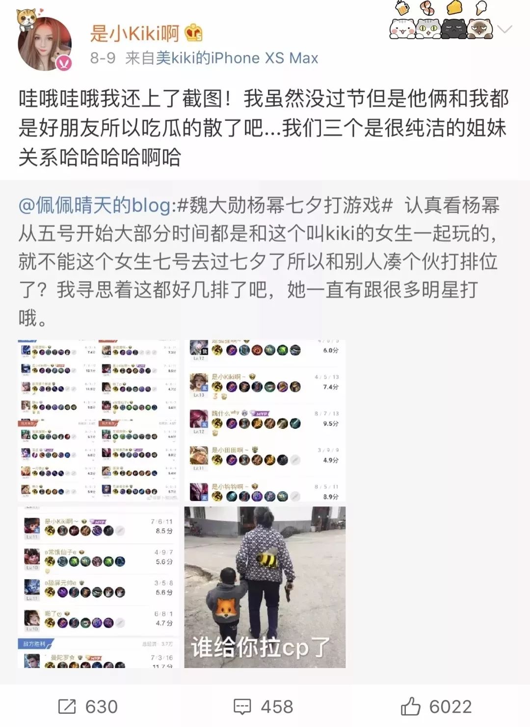 随后,与两人七夕当天一起打游戏的朋友kiki却发文否认二人感情,称三人之间只是纯洁的姐妹关系。