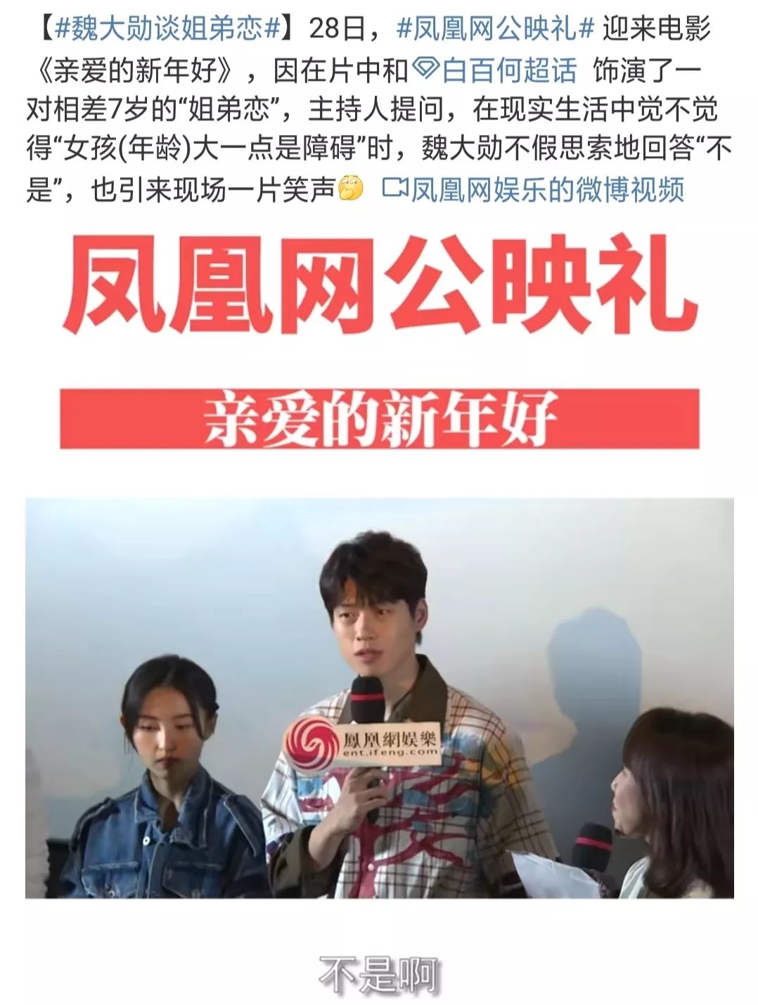 12月28日,魏大勋在参加某电影宣传活动时,因为在片中和白百何饰演姐弟恋,于是旁边的女主持人趁机采访魏大勋,询问他对姐弟恋的看法:“在现实生活中,你会觉得女孩大一点是障碍吗?”魏大勋脱口而出:“不是!