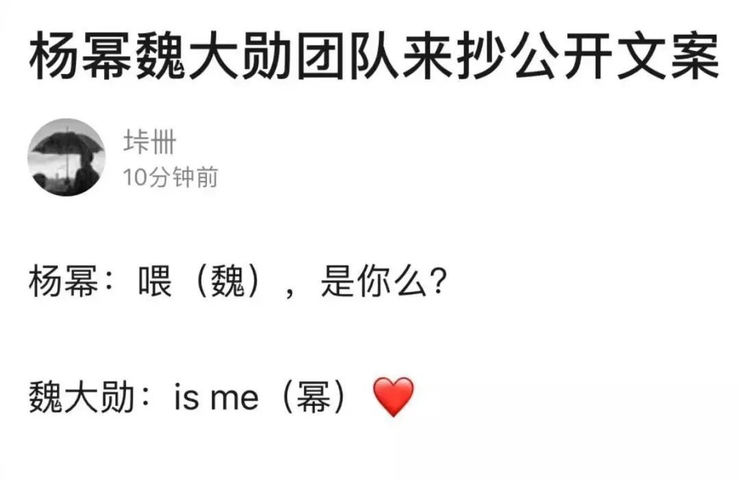 杨幂魏大勋同住酒店曝光后,双方都没有回应,但有的网友连恋情官宣文案都帮两人写好了。