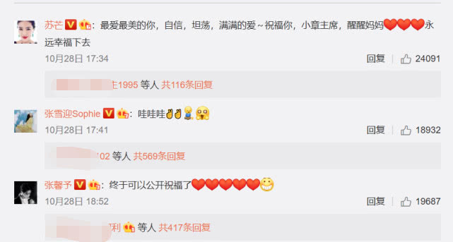 不少明星送上祝福,与章子怡合作过的女明星张雪迎、张馨予更是迫不及待发表祝福。