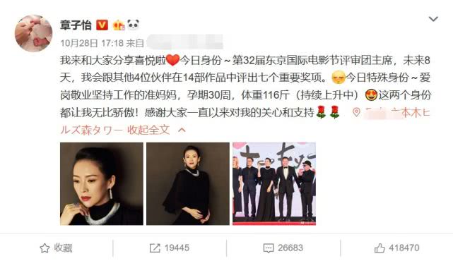随后,章子怡发文承认自己怀孕的事实:“今日特殊身份,爱岗敬业坚持工作的准妈妈,孕期30周,体重116斤。”